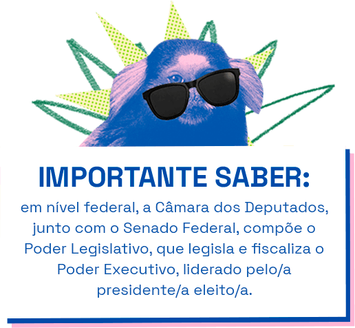 Importante saber: em nível federal, a Câmara dos Deputados, junto com o Senado Federal, compõe o Poder Legislativo, que legisla e fiscaliza o Poder Executivo, liderado pelo/a presidente/a eleito.